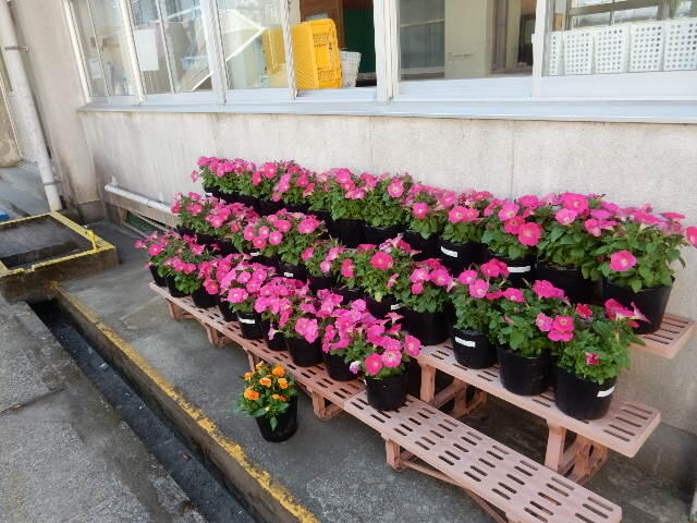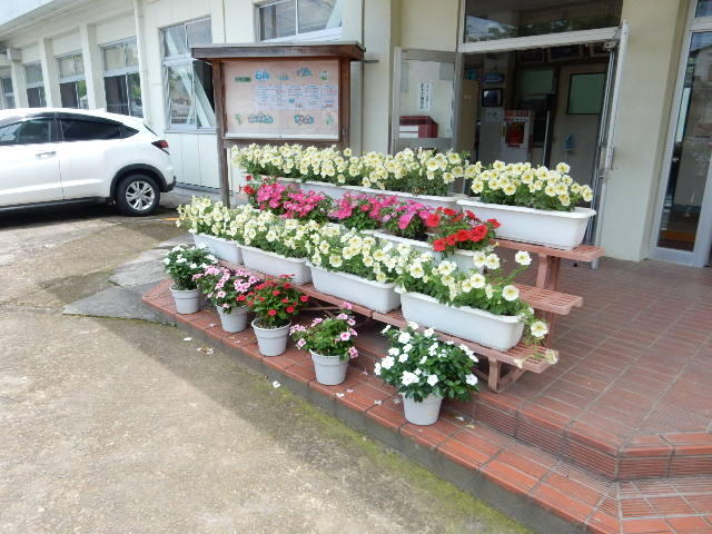 すでにご存じの方も多いと思いますが、本年度に入って、福小の玄関の景色が変わりました。今はペチュニアやニチニチソウがきれいに咲き誇っています。道路沿いの花壇にも先日、新しい花が植えられました。実は、これらの美しい花々は、教頭先生が毎日忙しい仕事の合間を縫って、手入れを続けてこられているものです。「子ども達、本校を訪れるお客様、町を行き来する方々、本校職員に少しでも心の潤いを・・・」という教頭先生の温かい心づかいによるものです。