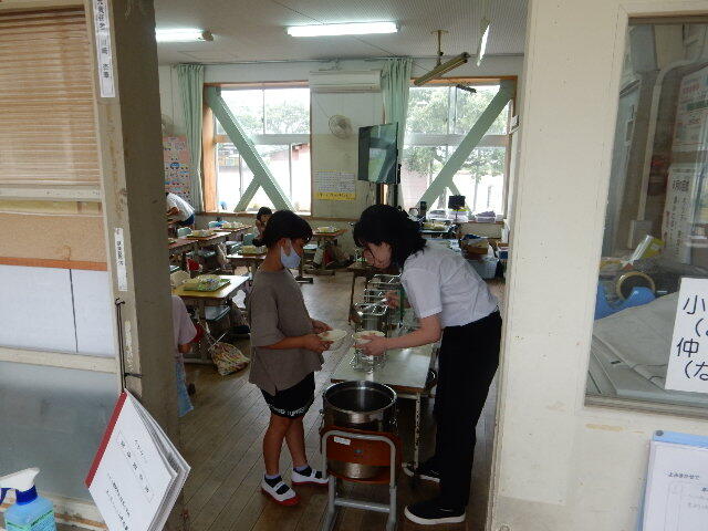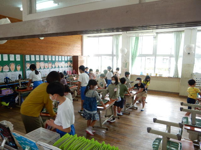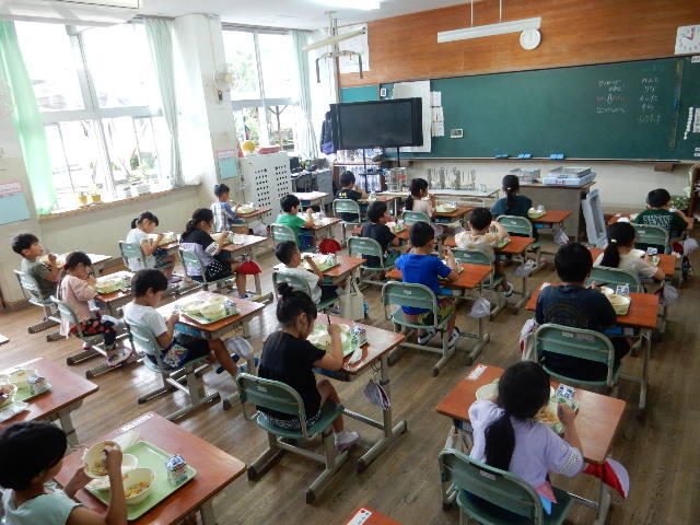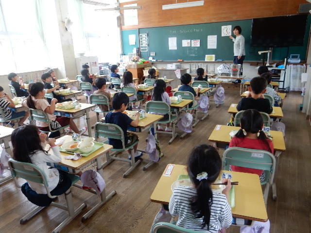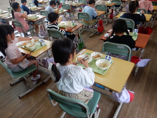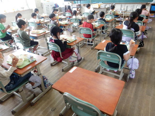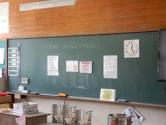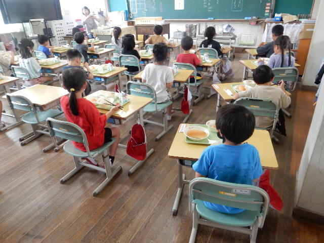 1年生の給食は、5年生と6年生が準備してくれています。下の写真は、今日も立派に役目を果たして、教室へ戻っていく5年生の後ろ姿。その姿、かっこいいですよ!お疲れ様でした!