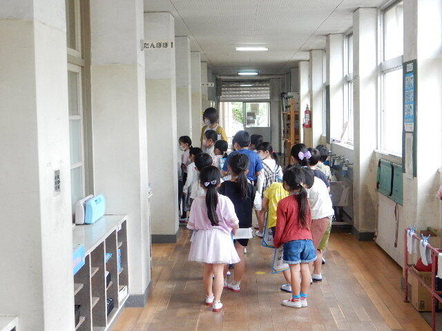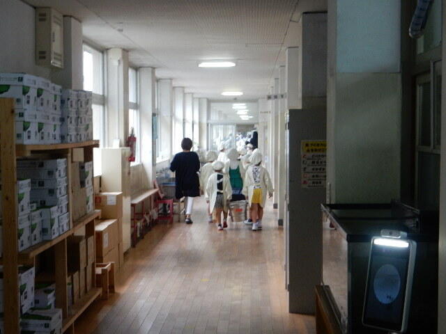 全ての片付けが終わると、再び、こうして並んで教室へ帰っていきます。今日も無事に終わりましたね。当番さん、ありがとう!ご苦労様でした!