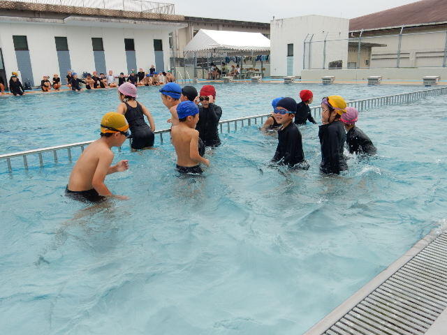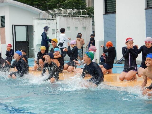 今年の水泳指導は大プール、小プールともに、2クラスずつで使うことにしていますが、写真の時間は5年生と1年生のそれぞれ2クラスが今年初めての水泳。はじめはやや緊張気味の子ども達もシャワーを浴びると気持ちも一気にアップ!皆さん、冷たい水の感じはどうでしたか?