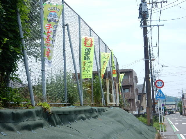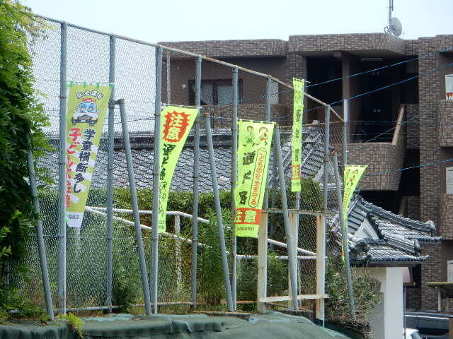 先日、写真のような交通安全啓発の旗を5本設置しました。(旗は、福島地区青少年育成協議会より提供されたものです。)