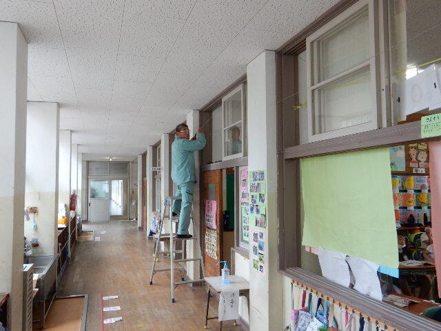 1年生の廊下で、環境整備員さんが何やら作業中。近くに行って尋ねてみると、子ども達の作品を掲示できるように、針金を設置しているところでした。入学以来、図工の時間の作品など子ども達の活動の足跡が増えてきました。教室掲示だけではなく、学年のお友達にも一人一人の作品を見てもらって、その頑張りをみんなで分かち合おうという先生たちの温かい心遣いによるものです。そして、その心遣いに響いた環境整備員さんが黙々と作業に取り組んでおられたという訳です。