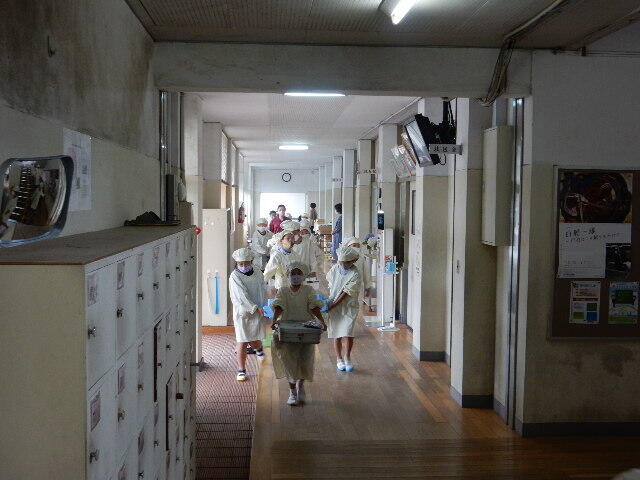 毎日4校時終わりの11時50分から12時過ぎの間、職員室前のろうかでは、各学級の給食当番さんが手分けしてその日の給食を運んでくれている様子を見ることができます。