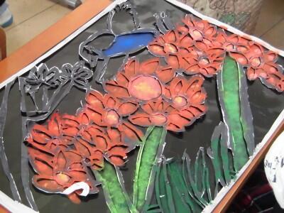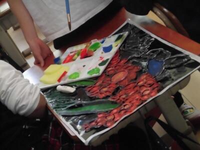 画用紙に絵を描きます。その後、くりぬいた画用紙を黒のステンシルに貼り合わせ、絵の具で色をつけていくそうです。
