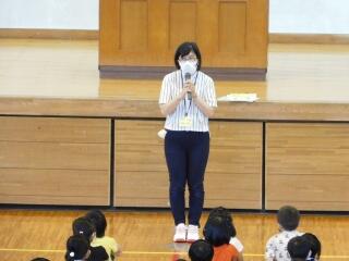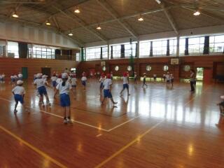 準備運動をした後は、話を真剣に聞いています。