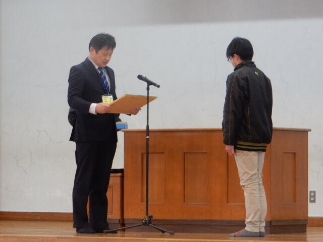 この度、県スポーツ協会から優秀賞と奨励賞が本校児童1名ずつに贈られ、全校児童の集まる集会の場で校長が贈呈しました。