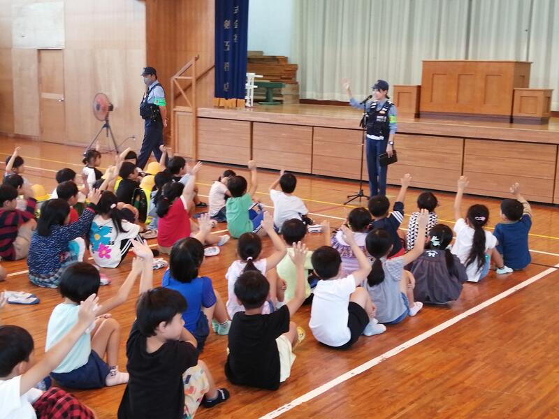 今日は串間警察署の御協力をいただいて、1年生を対象に不審者対応避難訓練が行われました。まずは、児童の登下校時を想定して、運動場で不審者役の警察署の方が子どもたちに声をかけるという想定で実際の対応の仕方について学びました。子どもたちの中には、警笛を吹こうとしたり、はっきり誘いを断ろうとしたりする子どもも見られました。                                                                                                 そのあと体育館に移動して警察署の方から絶対に誘いに乗らないこと、特に「いかのおすし」、「いか・・・行かない の・・・乗らない お・・・大きな声を出す す・・・すぐ逃げる し・・・知らせる」をしっかり守ることを教えていただきました。
