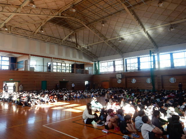 写真は、体育館の様子です。3つの地区が分かれてそれぞれの担当の先生のお話を聴きました。また、各教室でも集会を行いました。