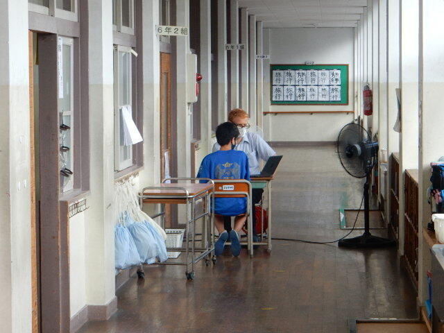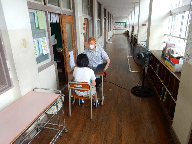 テストの様子は下の写真にあるとおりです。私たちの時代には全くなかったことなので、子ども達の英会話に自然に取り組んでいる姿には本当に驚きです!