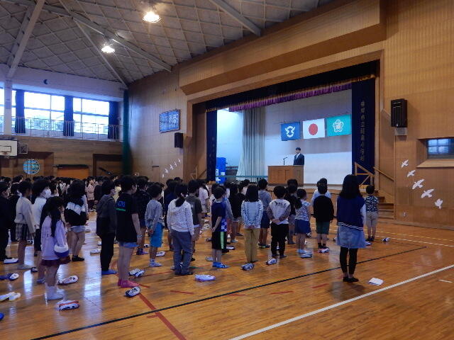 続いて、私(校長)の話でした。春休み中に大きな事故などがなく、無事に新年度を迎えられてとても嬉しかったこと、進級にあたっての各学年への期待などの話をしました。(下の写真は話の始まりの様子です。この後、子ども達はその場に座って話を聴きました。)