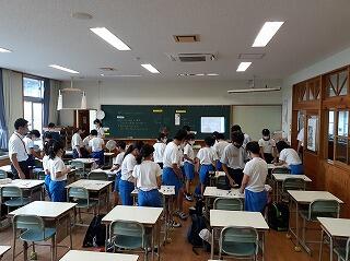 本日午前中、串間中学校に市内の小学6年生が集まり、合同学習が行われました。中学校で体育の授業や教室で数学や英語の授業を共に経験することを通して、中学校生活に向けて期待をもつことと同時に、他校の6年生との交流を図ることが目的です。