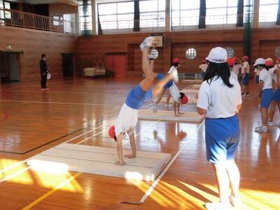 体育館では、5年3組が、基本の技ができるようになるにはどうしたらよいかを考えながら、マット運動をしていました。