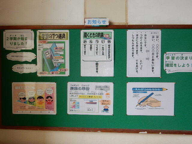 学習の7つ道具や学習場面での基本的な約束などについて、ていねいなお話がありました。話の内容は、現在、下のように階段掲示板にも掲示してあります。