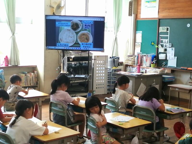 今日は、近隣の串間中学校から栄養教諭の先生に来ていただき、1年生へ授業をしていただきました。「たべもののパワーをしろう」というテーマで、食べることの大切さを学びました。 「ちからもりもり」「からだぐんぐん」「げんきるんるん」の3つの視点で、子どもたちと一緒にそれぞれきちんと食べることでどんな力が身に付くのか、どんな食べ物があてはまるのかを考えていきました。子どもたちは、初めて教えてもらう先生の話に熱心に聞き入っていました。早速この後給食です。残さず食べることができるでしょうか。
