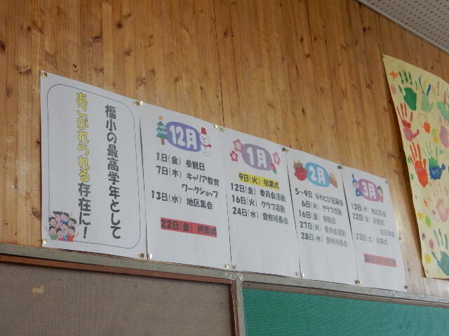「福小の最高学年として、あこがれられる存在に!」と書いてあります。令和6年度を見据えて、スムーズに学年のステップを上がることができるようにとの担任の先生の願いを込めた掲示です。