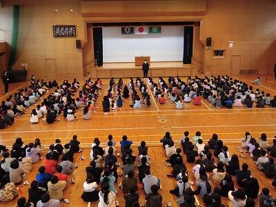 始業式後には、生徒指導部の先生から、「先手必勝のあいさつ」「廊下歩行」「お金について」「遊び方」に気をつけましょうとお話がありました。