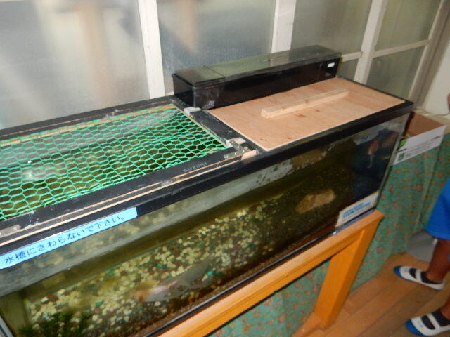 実は、昨日、下の写真のように、環境整備員さんに水槽のふたを作っていただいたのです。金魚の「飛び出し防止」のためです。
