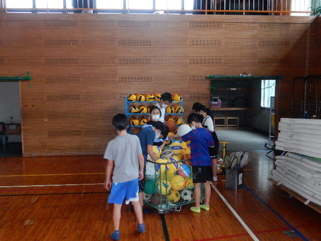 この時は、体育館のボールの空気を1個ずつ確かめ、抜けているボールに空気を入れていました。