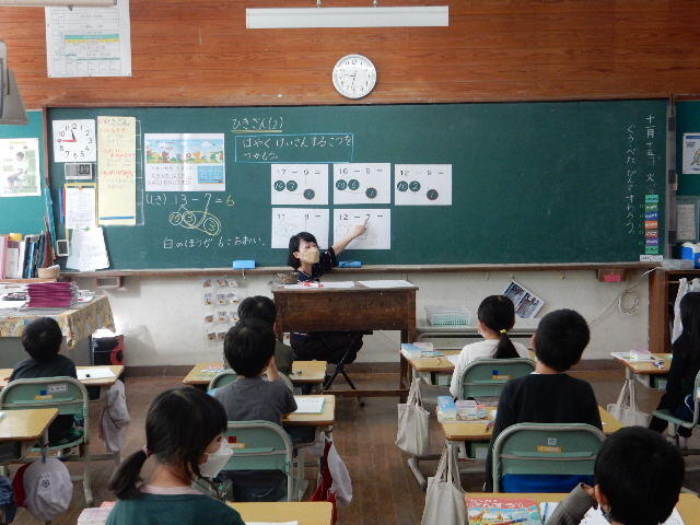 1年生の算数はひき算の学習でした。速く計算できるコツを見付け、それを身に付けることが目標の授業でした。担任の先生は、3つの計算例を子ども達に示しながら、比較させて、そこから見えてくる規則性・一般性を見付ける活動を取り入れていました。また、子ども達が見付けた規則性・一般性を他の問題に当てはめながら、その答えを類推させる活動も取り入れていました。そうです。「数学的な考え方」を大切にした授業なのです。1年生も後半に入り、学習内容もずいぶん深まってきましたが、このように、単に結果を求めるだけではなく、結果に至るまでの過程に着目した算数の研究授業でした。
