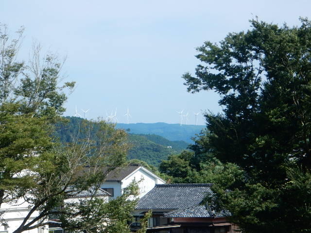 視線を少し上向きにすると、遠くに、串間風力発電所の巨大な風車の群れが見えます。その巨大さがここでも伝わるので、インパクトがありますね。