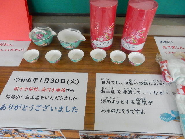 先日、本校を訪問した台湾の小学校からいただいたお土産を職員室前のろうかに展示しています。台湾では、お土産を手渡すことを通して、相手とのつながりを大切にする習慣があるのだそうです。