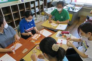 次は、実際に工作を通して、授業の在り方を検討しました。「子ども達に身につけさせたい技能や能力をどのように育むか」「図工に限らず、算数、国語でも活かすことはできないか」等考えています。