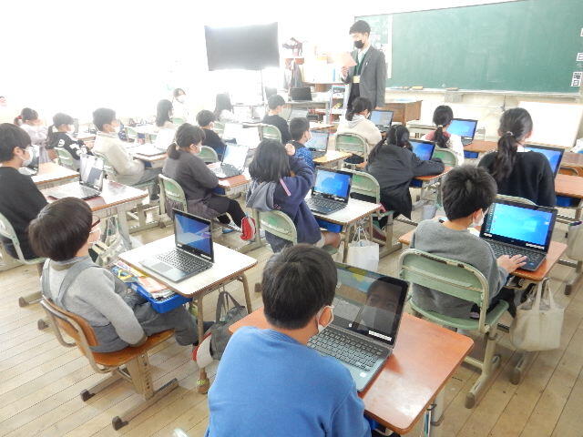 先日、端末の使い方やルールなどについて、各学級での確認を行いました。ICT担当の先生の説明の後、各学級担任の先生によって進められました。今や学習用具のひとつの端末。きまり正しく有意義に使用しましょう。