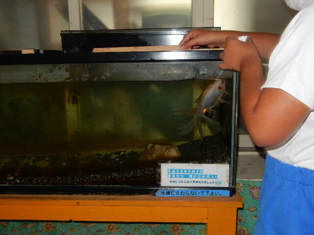 水槽には、「平成23年」と書かれてあるシールが貼ってありますので、もう10年間も福小に住んでいるようです。ずいぶん大きく成長したため、1学期に、飛び跳ねた金魚が水槽から飛び出してしまったことがありました。そのため、上記のようなふたの設置に至ったという訳です。余談ですが、金魚は大切に育てれば20年は生きると聞いたことがあります。ずっと長生きしてほしいものです!
