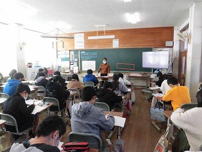 3年3組の教室で、教職経験10年を経過した中堅教諭の研究授業が行われていました。中堅教諭等研修では、教員の能力、適性等に応じた研修を実施し、教科指導、生徒指導等、指導力の向上や得意分野づくりを促すことをねらいとしています。