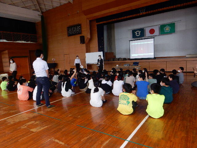 5校時は体育館で、6年生の租税教室でした。串間市役所から2名の担当職員の方が来校され、税金は私たちの身の回りでいろいろなところに使われていることなどをお話やクイズ、DVDを使って、分かりやすく教えていただきました。一部を紹介しましょう。「小学生一人が1年間学校に通うために、国や県・市町村の税金はいくら使われているでしょうか? ①約36万円 ②約56万円 ③約88万円 どれが正解でしょうか?」「正解は、③の約88万円です。1ヶ月では一人当たり7万円ということですね。ブリぷり丼も70回食べられる計算になります。」今日の学習をきっかけに、税について少しでも興味をもってくれるといいです。