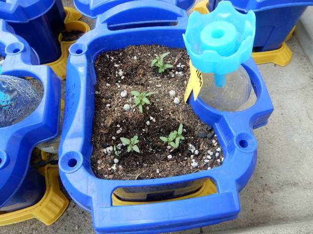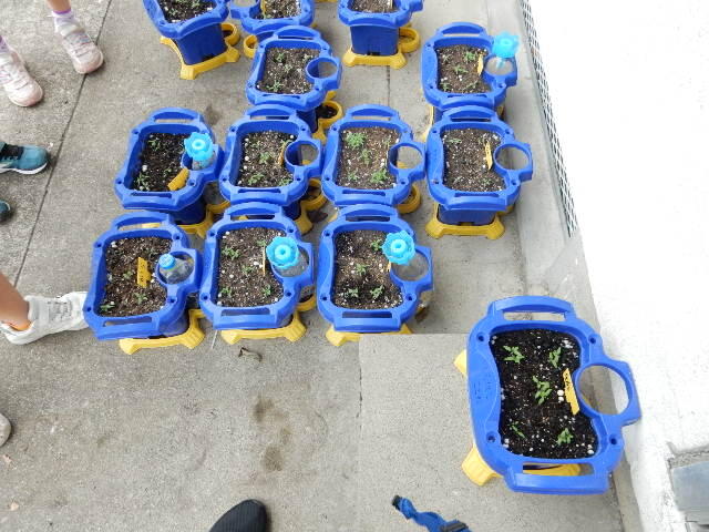 2年生教室の近くを通っていたら外から楽しそうな声が聞こえてきたので、少し様子を見に行ってみました。4月の終わり頃、このホームページでミニトマトの種まきを紹介しましたが、何と、可愛らしい芽がたくさん出ていました!また、サツマイモの苗もすくすくと元気に生長していることもわかりました!子ども達は発芽した小さな命を熱心に観察しながら、シートに絵や文で記録していましたよ!これからの生長がますます楽しみですね!