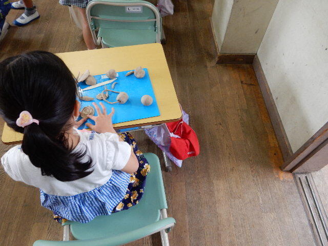 1年生が図工の時間に粘土を使った活動をしていました。粘土は、どのような形にも変わりますし、作ったものが自分の活動の成果として目に見えてわかる素晴らしい素材です。みんな思い思いに自分が作りたいものづくりに没頭していました。いつだったか、子どもは「手」で考えると聞いたことがあります。たくさん考えて、そして自分だけのオリジナル作品を完成させた子ども達。達成感もひとしおでしたね。