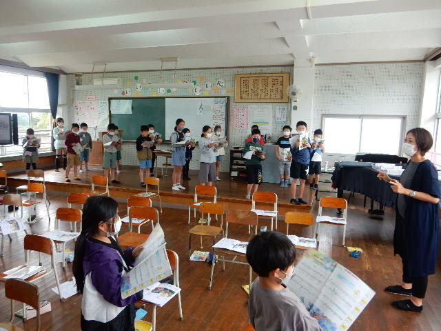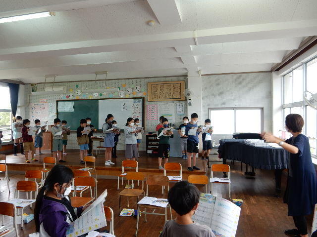 福島小の特別教室棟3階にある音楽室、子ども達の歌声が聞こえてきたので階段を上がっていくと、音楽室では、ちょうど4年生が合唱の学習をしているところでした。「心をひとつにして歌うんですよ」という先生の言葉を胸に、どうしたら一つにできるかを考えながら歌う子ども達でした。そうです、「友達の声を聴きながら」歌うんですね。友達のよいところも進んで見つけていましたし、友達とのつながりを深める音楽の時間でした。