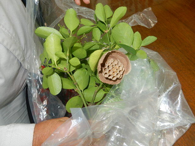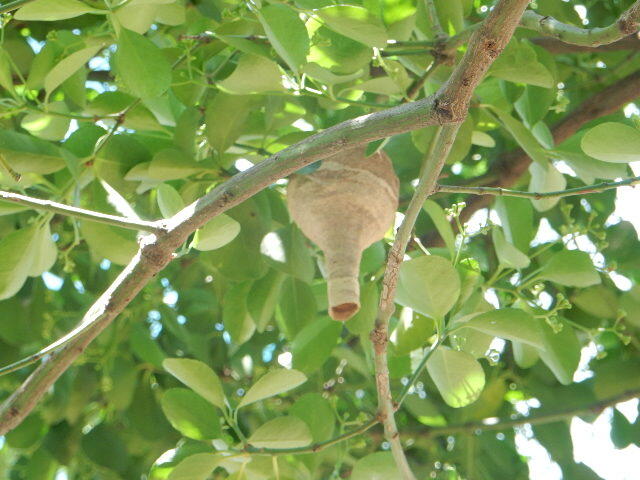 どこに巣があるか分かりますか?よーく見ると、2枚目の写真のとおりです。調べてみるとコガタスズメバチの巣でした。小型で攻撃性は高くないとのことでしたが、毒性はオオスズメバチと同様だそうです。