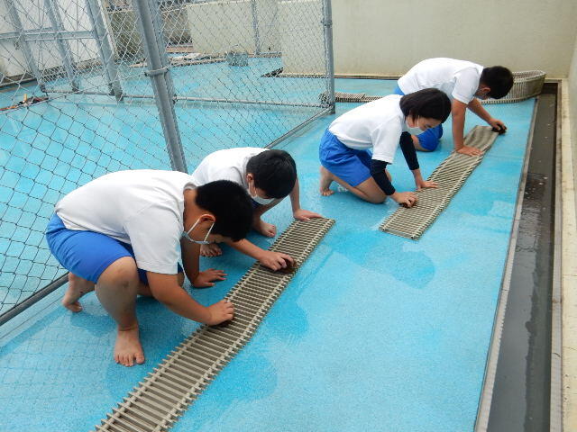 6月1日はプール開き、そこで、6年生がプール清掃に取り組んでくれました。今日は午後から雨の予報で、何とか午前中にきれいにしようと6年生が協力して頑張ってくれました。約1年ぶりに使うとあって、大変な部分もありましたが、隅々まで熱心に清掃していた6年生でした。これから時間をかけて新しい水を貯めていくことになりますが、満水となれば、きっとキラキラと光り輝く美しいプールが見られることでしょうね。6年生の皆さん、ありがとう!お疲れ様でした!