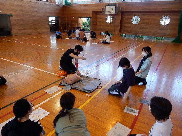 6月1日から水泳指導が始まります。プールにはもうきれいな水が満水状態となり、いつ始めてもよい条件が整いました。そこで、先生方は、もしもの場合を想定して、AEDの使い方や心肺蘇生法の確認を行ったところです。