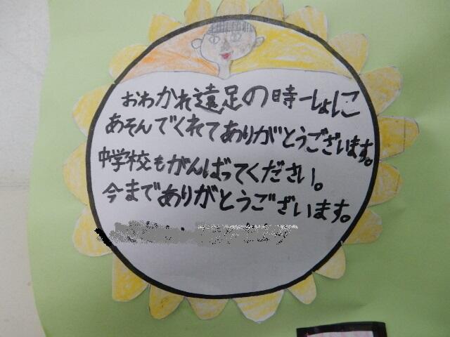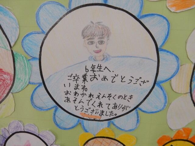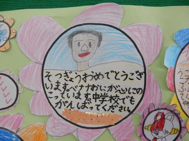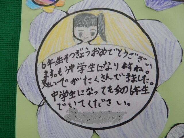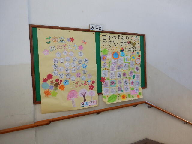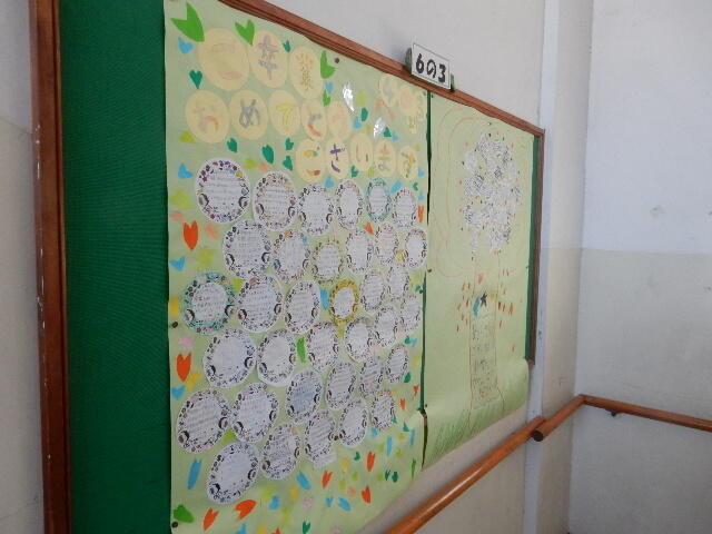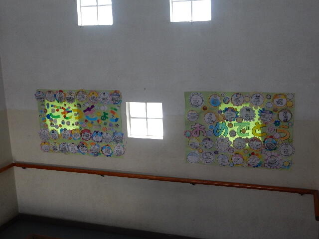6年生が毎日生活している北校舎2階へ上がる階段の踊り場に今、在校生からのメッセージが掲示してります。