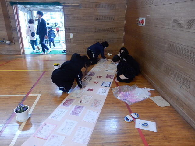 明日の卒業式に向けて、午後は、5年生の皆さんと職員で前日準備に取り組みました。5年生は在校生の代表として、力を合わせて1~4年生の分まで準備に頑張ってくれました。どうもありがとう!