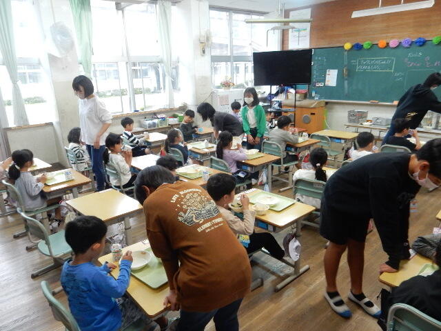 また、1年生は今日から給食も始まりました。途中から、6年生の皆さんがお世話に来てくれました。どうもありがとう。