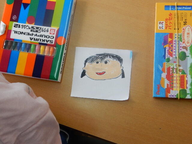 3時間目、1年生の教室では、図工の時間に子ども達が自分の似顔絵を描いていました。思い思いに楽しみながら取り組んでいる1年生の子ども達、かわいい顔がたくさん描かれていて、作品を観ながら思わず笑顔になる、そんな時間でした。
