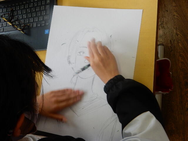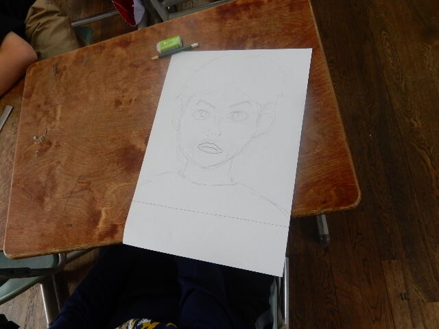 同じ時間、1年生の教室から2階へ上がってみると、なんと6年生の教室でも1年生と同じ図工の時間、自分の似顔絵を描いているところでした!