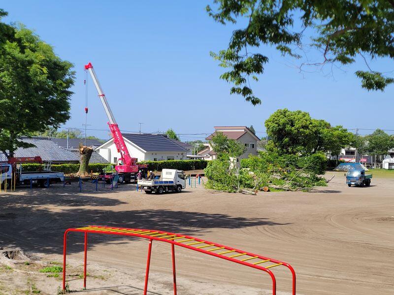 大木でしたので、当日はクレーン車も使用する大変大がかりな作業でした。長い年月、福島小を見守り続けていた大木でした。ありがとうございました。