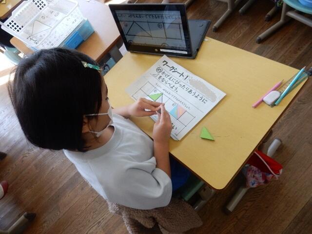 担任の先生は、さらにそこに、一人一台のタブレット端末を活動に取り入れていました。学習問題に対して、色板を使って試行錯誤しながら導き出した答えを、タブレット端末で自分で撮影し、その画像をもとにワークシートに解答を書き込んでいく活動でした。