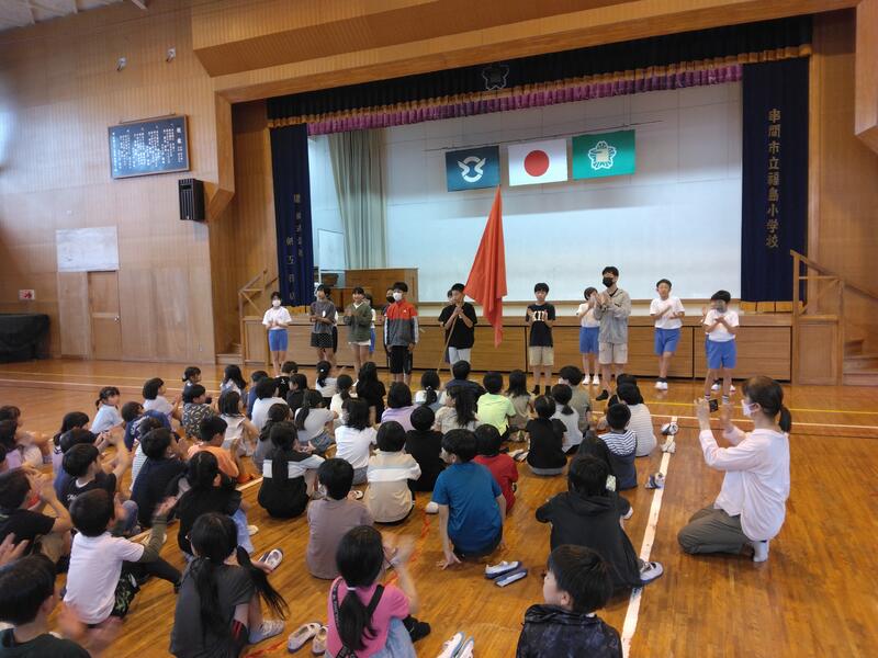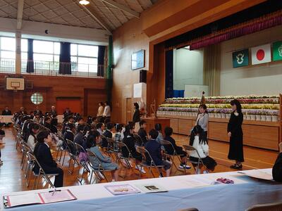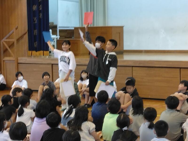 本校の本年度の運動会は5月26日(日)です。先日運動会の団結式が行われました。一番盛り上がったのは、やはり自分たちが赤、白、青のどの団になるか決める瞬間でした。団長が封筒の中から色紙を引き出すと大歓声でした。そのあと団長に団旗が渡された後、団ごとに集まり応援をしました。「一致団結、羽ばたけ勝利、輝け優勝」のスローガンのもと、499名の児童が運動会の練習に毎日励んでいます。
