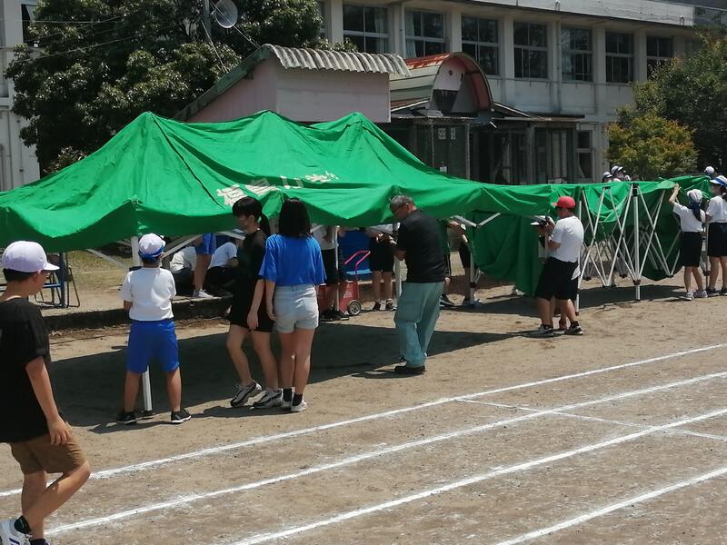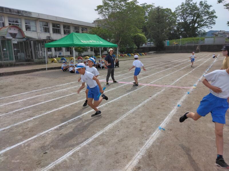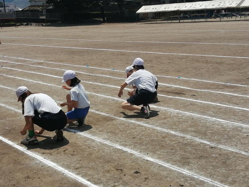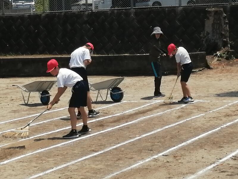 明日は運動会です。例年秋に行われますが、本年度は5月実施です。短い練習期間、そして雨模様の日も多かったのですが子どもたちは一生懸命練習に励みました。そして、明日は運動会。今日は4時間目に5,6年生がグラウンド整備や校舎周辺の掃除、机・いすの準備などの運動会の準備をしてくれました。午後には、PTAの皆様に退場門の設置や観覧席等のロープを張っていただきました。準備万端、明日は雨の心配もないようです。