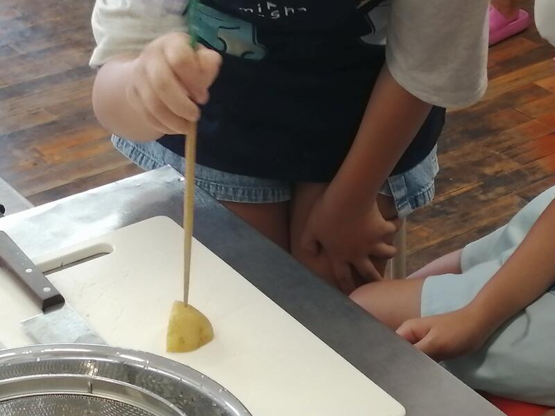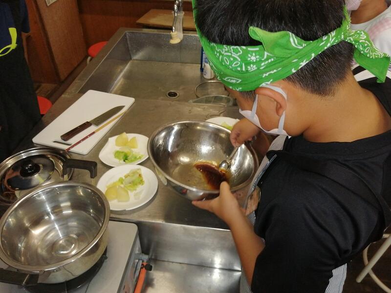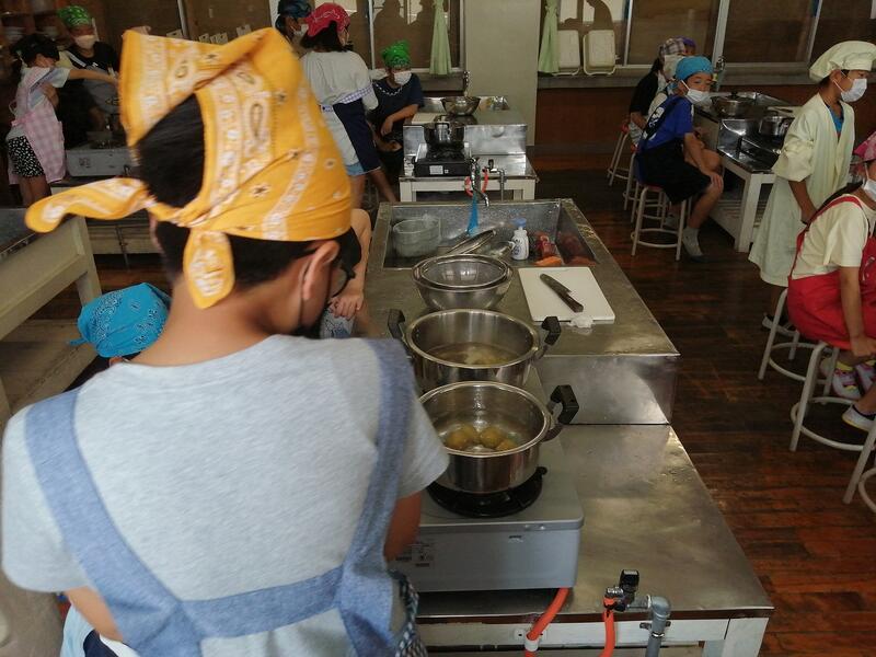 今日は5年生の調理実習が行われました。暑い家庭科室の中での火を使った実習ですので子どもたちは随時給水をしたり、扇風機、クーラーのある教室で涼んだりしながら学習を進めました。 今回は、「温野菜サラダ」をつくりました。使う野菜はジャガイモとキャベツです。ゆでながら、芯がないかを確かめていきました。その間、子どもたちは鍋と向き合いながらゆであがるのをじっと見ていました。野菜がゆであがってある程度冷ましたらドレッシング作りです。今回は和風と中華風のドレッシングを自分たちで作りました。出来上がった温野菜のサラダ、みんな笑顔で食べていました。