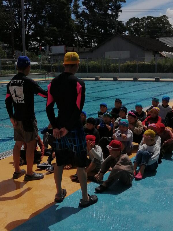 今日は串間市消防署の方の協力をいただいて、3年生を対象に着衣泳「ういてまて教室」が行われ、水の事故に遭遇した場合の対応の仕方について学びました。今回子どもたちは水着の上から服を着て、さらに履物をはいて学習に臨みました。 まず消防署の方から、全国で毎年多くの水の事故が発生していること、そしてたくさんの方が亡くなっていてその中には小学生も含まれること等、水の危険についてのお話がありました。そのあと、プールに入る前の水慣れの仕方、プールへの入り方、おぼれた時の助けの求め方などを実際に見せていただいて、プールに入りました。水の中に入ると、子どもたちはいつもと違って服を着ていてさらに履物もはいているのでとても動きにくいことを体感していました。 そしていよいよペットボトルを使っての水に浮く学習を行いました。最初はうまく浮かずに何回も挑戦していましたが、力を抜くと上手に浮くことを教えてもらうと、子どもたちはすぐにプカプカと水に浮くことができるようになっていました。 夏休みを前に、命を守るための学習でしたが、この学習が生かされることがないことを願うばかりです。