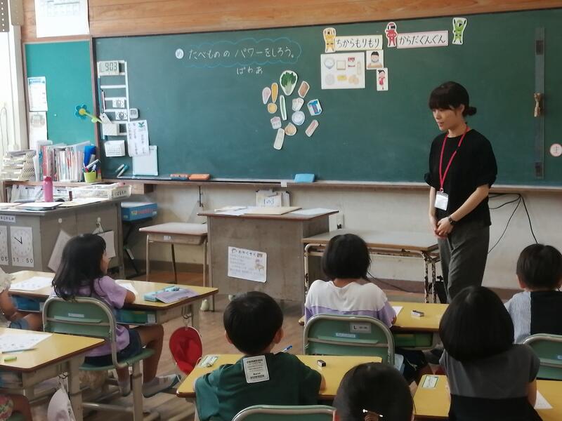 今日は、近隣の串間中学校から栄養教諭の先生に来ていただき、1年生へ授業をしていただきました。「たべもののパワーをしろう」というテーマで、食べることの大切さを学びました。                                        「ちからもりもり」「からだぐんぐん」「げんきるんるん」の3つの視点で、子どもたちと一緒にそれぞれきちんと食べることでどんな力が身に付くのか、どんな食べ物があてはまるのかを考えていきました。子どもたちは、初めて教えてもらう先生の話に熱心に聞き入っていました。早速この後給食です。残さず食べることができるでしょうか。