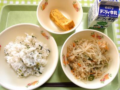 今日の給食のメニューは、減量菜飯、マーボー春雨、厚焼きたまごでした。