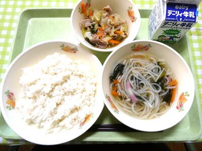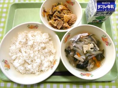 今日の給食のメニューは、麦ごはん、牛乳、魚そうめん汁、豚肉のチャンチャン焼きでした。